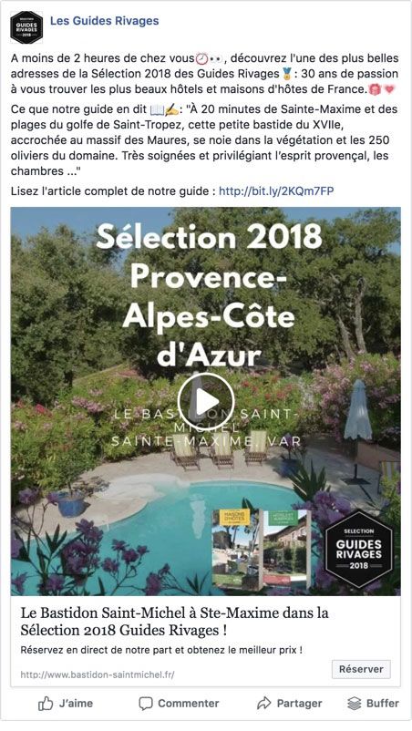 As Jean de BEAUMONT recalls, the founder of Guides Rivages: *”Facebook is an extraordinary sounding board for very specific products such as tourist guides but also charming hotels and guest houses.. Since the beginning of the year, we invested deeply in this universe and we recorded incredible results : par exemple,== this summer, our articles and hotel and guesthouse recommendations have been seen by nearly 2 Millions of people and our videos have been viewed over 300.000 fois !== We could never have achieved such results with only our website !”.